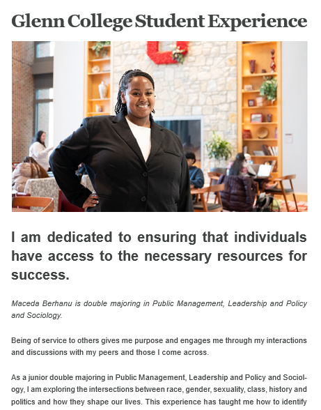 Recruit and yield diverse populations of students into the Glenn College educational programs by increasing awareness of the discipline, college offerings, community value and career outcomes.